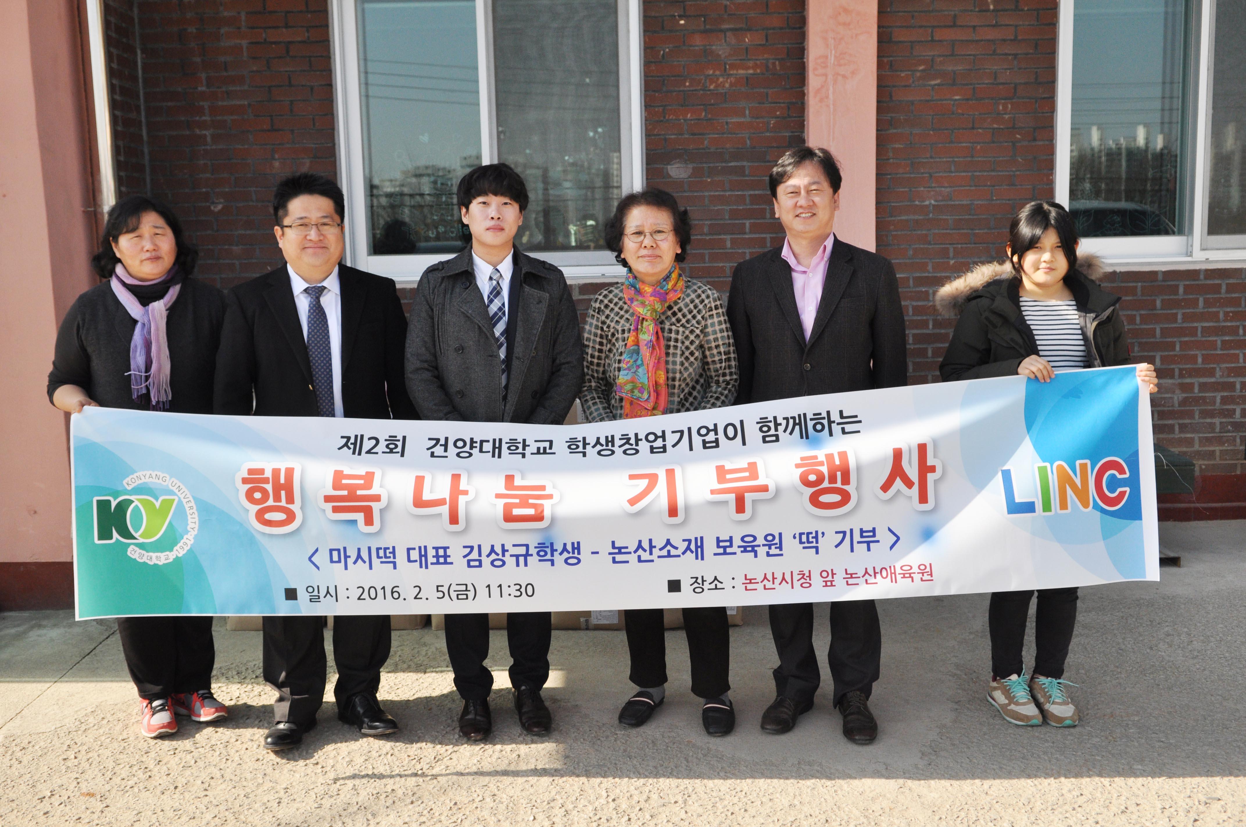 건양대 학생창업기업, 냉동찹쌀떡 기부 지역 애육원 방문해 찹쌀떡 100박스 기부 건양대학교(총장 김희수) 학생창업기업인 ‘마시떡’이 지난 5일, 논산 애육원을 방문해 자사 제품인 냉동찹쌀떡을 기부해 병신년 새해를 훈훈하게 했다. 이번 기부는 2014년 12월 초콜릿 기부에 이은 두 번째 학생창업기업의 기부로 설 명절을 맞이해 학생창업의 결실로 맺은 제품을 지역 아이들과 함께 나누고자 마련했다. 이 날 행사에서 논산애육원 아이들은 물론, 관계자들에게 냉동찹살떡 총 4종(냉동딸기, 냉동블루베리, 냉동호박, 냉동호두) 100박스를 기부했다. 이 제품은 ‘마시떡’기업의 2015년에 만든 신제품으로 현재까지 2,000만원 가량의 판매실적을 올린 떡이다. 학생창업기업 ‘마시떡’ 대표 김상규(글로벌경영학부 4)씨는 “아이들이 내가 직접 개발하고 만든 떡을 먹으며 미소 짓는다는 것만으로 나에겐 값진 일이다”라고 말하며 “앞으로도 더욱 다양한 냉동떡을 선보이며 학생창업대표로써 멋진 성과들을 보여주고, 꾸준한 기부활동을 펼치고 싶다”고 전했다. 한편, 학생창업기업 ‘마시떡’은 제12회 WTA 대전하이테크페어 및 비즈니스 컨퍼런스(창업아이디어 옥션마켓), 제3회 창조경제 활성화를 위한 창업경진대회에서 냉동과일모찌로 우수상을 수상하고 ‘2015 학생창업문화로드쇼 창업지락-충청권 창업동아리 경진대회’에서 우수상을 수상하면서 그 입지를 단단히 다져나가고 있다.