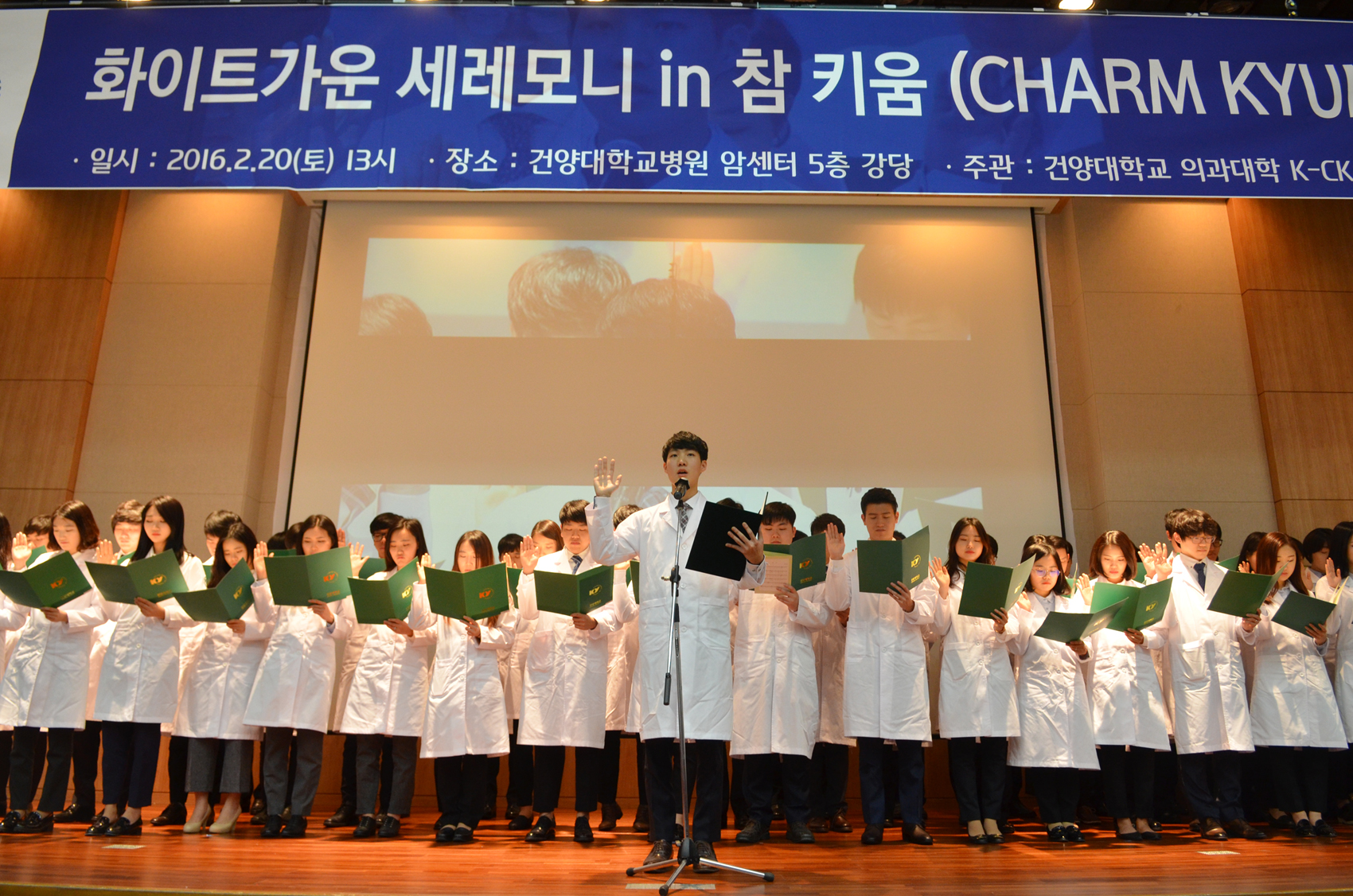 건양대 의과대학, ‘화이트가운 세레모니’ 개최 인술을 펼치는 참된의사로서의 길 다짐 건양대학교(총장 김희수)는 20일 건양대학교병원 암센터 5층 강당에서 의학과 재학생과 학부모, 교수 등 200여명이 모인 가운데 참된 의사로 가겠다고 다짐하는 ‘2016 화이트 세레모니’를 열었다. 화이트가운 세레모니란 건양의대 학생들이 중심이 되어 매년 개최하는 학과 전통행사로서 의과대학 5학년 학생들이 임상실습을 앞두고 의사의 상징인 흰가운을 입고 예비의사로서 명예와 자부심을 다짐하는 자리다. 이날 세레모니에서 건양대 김희수 총장과 건양대 최원준 의과대학장이 직접 학생에게 횐가운을 입혀주는 것을 시작으로 의과대학 모든 교수들이 학생 한명 한명에게 직접 화이트가운을 입혀줬다. 또한 재학생들의 학부모들도 참석해 함께 화이트 가운을 입혀주고 부모의 마음이 적혀있는 편지를 전달하는 뜻깊은 시간을 가졌다. 세레모니가 끝난 뒤에는 횐 가운을 입은 학생들이 좋은 의사가 되겠다는 굿 닥터 선서식을 했다. 김희수 총장은 이날 직접 흰가운을 입혀주면서 “의사의 본분은 인술이며 희생정신을 갖춘 진정한 의사가 되길 바란다”고 밝혔다. 최원준 의과대학장은 “오늘 화이트가운 세레모니가 질병이 아닌 사람을 치료하는 의사의 시발점이 되길 바란다”고 말했다. 의과대학 5학년에 올라가는 과대표 정일(만 22세)는 “많은 교수님들과 부모님, 동기들 앞에서 횐가운을 입고 굿닥터 선서문을 낭독한 만큼 좋은 의사가 되겠다는 지금 마음을 잊지않고 인술을 펼치기 위해 더욱 더 노력하겠다”고 밝혔다.