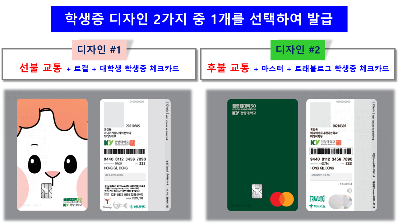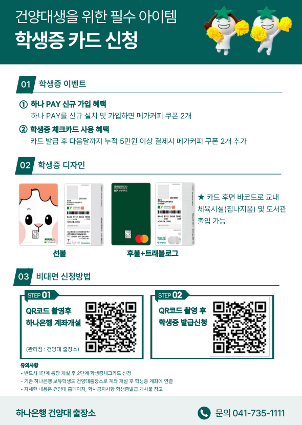 *1단계계좌개설바로가기 https://m.hanabank.com/cont/mybranch/1517/03/MYB15170130372/index.html *2단계학생증발급신청바로가기 https://m.hanabank.com/cont/mybranch/1517/03/MYB15170130394/index.html *학생증디자인 첨부파일 참고 - 선불선택시 캐릭터디자인/후불선택시 초록색디자인발급* □ 학생증 교부기간 : 2026. 3월 중순 이후 카드 수령 카톡 안내 △ 글로컬 캠퍼스(논산) : 하나은행 건양대출장소 (건양회관 2층) 교부 △ 메디컬 캠퍼스(대전) : 하나은행 건양대병원출장소(건양프라자 2층) 교부 □ 유의사항 △ 휴대폰이 본인 명의가 아니거나 20영업일 이내 비대면으로 개설한 계좌가 있는 경우(타은행 포함) 비대면 계좌개설 신청이 불가하며 발급기간 중 하나은행 건양대 출장소, 건양대병원 출장소 내점하여 신청 가능 △ 학생증 사진은 증명사진 또는 저장된 파일 업로드 가능(JPG파일만 가능), 증명사진 촬영은 사진의 바탕색보다 짙은 배경에서 가로방향으로 촬영 □ 카드발급 상담문의 △ 하나은행 건양대출장소 : 041-735-1111 (상담시간 9:00~17:00) △ 하나은행 콜센터 : 1599-2111(계좌개설문의), 1800-1111(계좌개설후 카드신청단계문의)