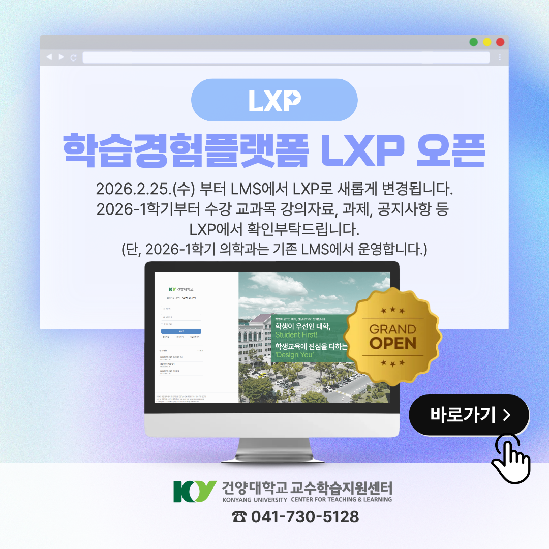 2026.2.25.(수)부터 건양대학교 학습관리시스템은 LMS에서 LXP로 변경됩니다. (단, 의학과는 2026-1학기 동안 LMS를 활용합니다.) *접속방법 : 스마트키 로그인 후 "LXP"아이콘 클릭