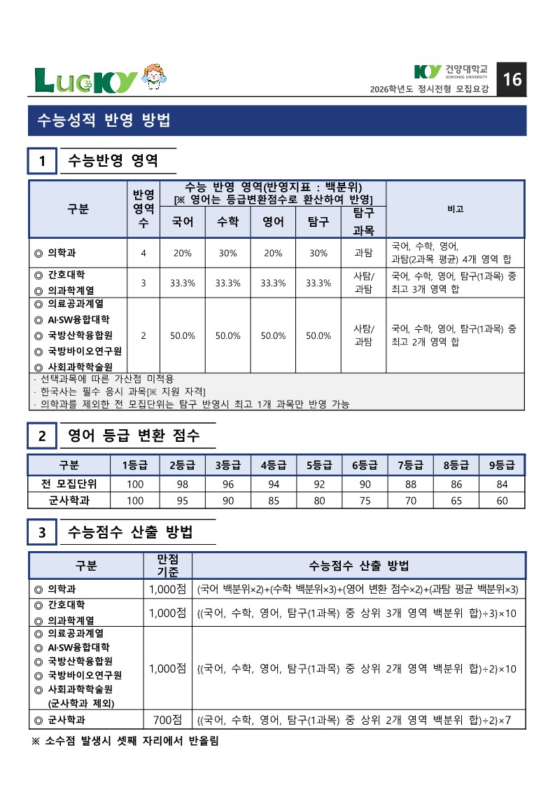 2026학년도 정시전형 수능성적 반영 방법을 안내드립니다. 참고해 주시기 바랍니다.